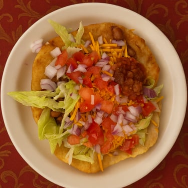 Navajo Taco: Homemade fry bread topped with chili beans, ground beef, lettuce, cheese, and tomatoes.